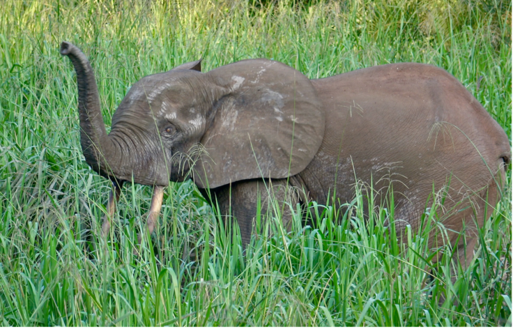 こうした生き物たちとマルミミゾウの間に直接の接点はないかもしれません。でも、もしゾウがいなくなってしまったら、種子の拡散が難しくなる植物もあり、長い年月の間には森のバランスが変わってしまいます。葉っぱや果実を食べるサルたちも、植物をよりどころにする昆虫も、それを食べる鳥たちも、みんな何らかの影響を受けるでしょう。