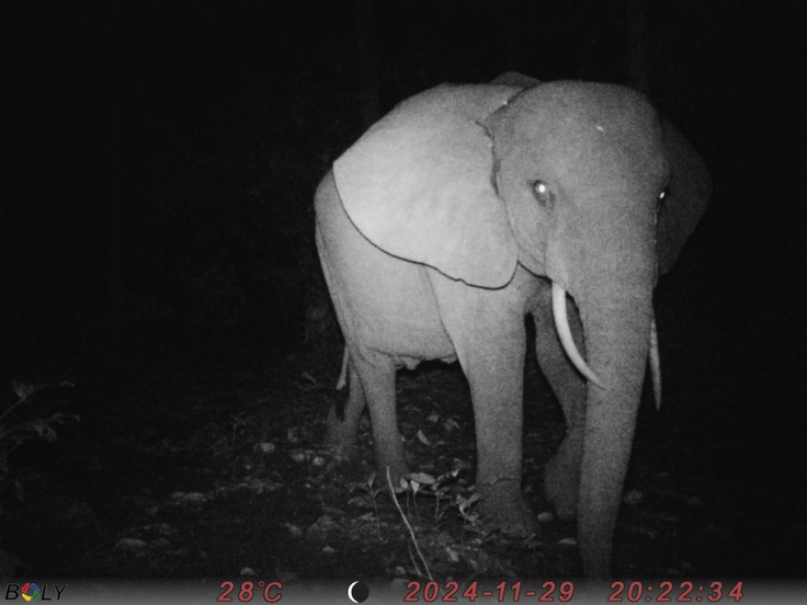 昼間でフラッシュの光もないおかげか、なんのためらいもなくカメラトラップの方へノシノシと歩いてきます。驚くのはこの巨体でも、足音がほとんどしないこと…。メスよりひと回り大きい牙も太い重たいオス、何トンもの体重があるはずですが! これがジャングルの中では曲者。見通しの効かない薮の中で、いきなり出会い頭にこんなオスゾウに出会ってしまったら…🙀