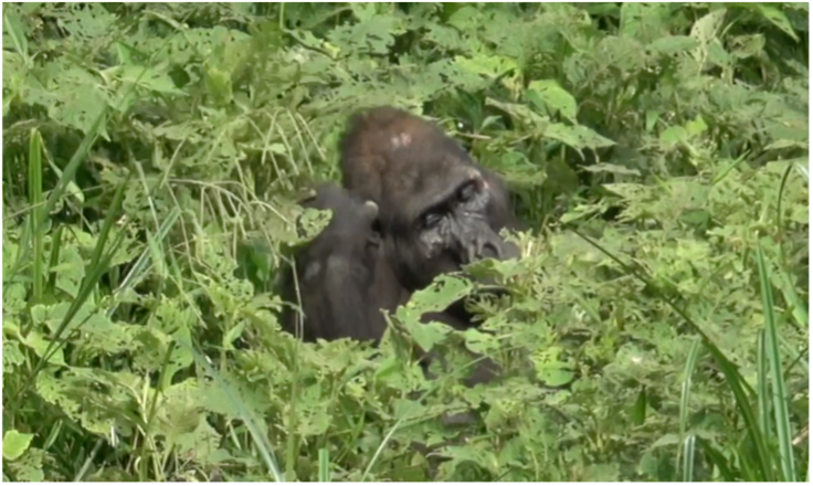動画では、1頭のゴリラの行動が観察できるかと思います。草木の中で休んだり、虫が気になったのか腕で払い除けたりと、人間臭い行動に微笑ましさを感じます。しかし、よく見てみると左腕に2箇所、顔面及び頭部に1箇所ずつ、脱毛して皮膚が荒れている様子が分かるかと思います。この原因として、他個体あるいは他種動物由来の外傷だけではなく、このゴリラ自身の感染症の可能性も考えられます。