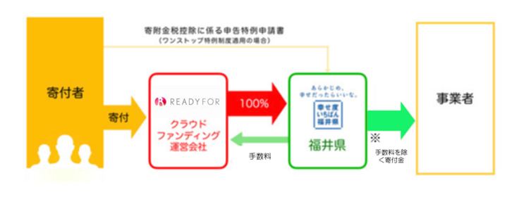 本プロジェクトは、福井県の「ふるさと納税による新事業創出支援事業」の対象事業として認定されています。 そのため、このプロジェクトに対する個人による寄附はふるさと納税の対象となり、ご寄附頂いた額に応じて、個人住民税等から一部が控除されます。(企業版ふるさと納税の対象ではないため、法人による寄附はふるさと納税の対象となりません。) 寄附金は福井県がふるさと納税として領収し、その寄附金から寄附代行手数料を除いた額を、奨励金として事業者に支給します。