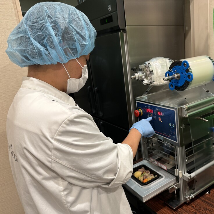 前回、ご紹介した盛付けた包材に、急速冷凍機の―35℃の液体アルコールに漬けて、凍結しますが、液体アルコールの侵入を防ぐために、包材の上部にシールをします。