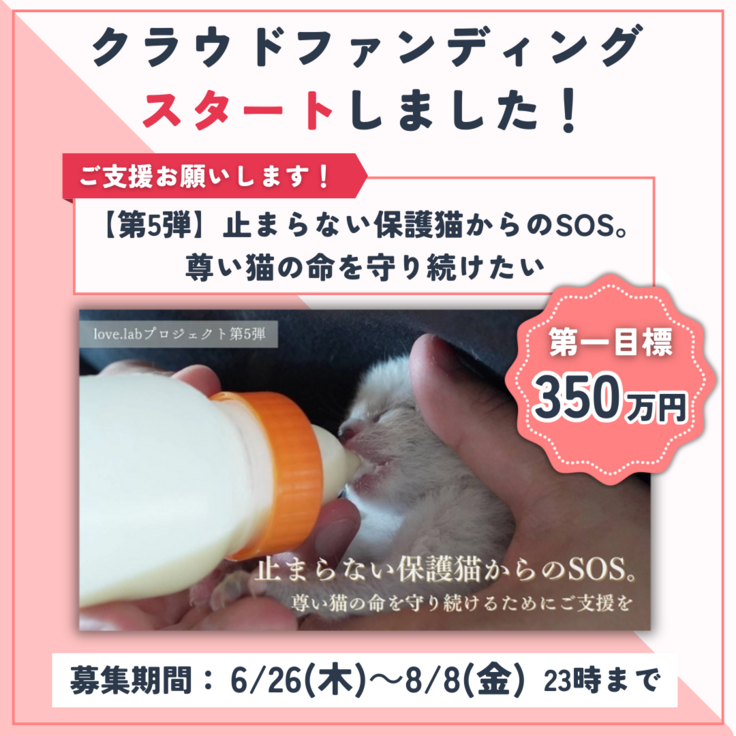 本日より、クラウドファンディング「【第5弾】止まらない保護猫からのSOS。尊い猫の命を守り続けたい」がスタートしました!