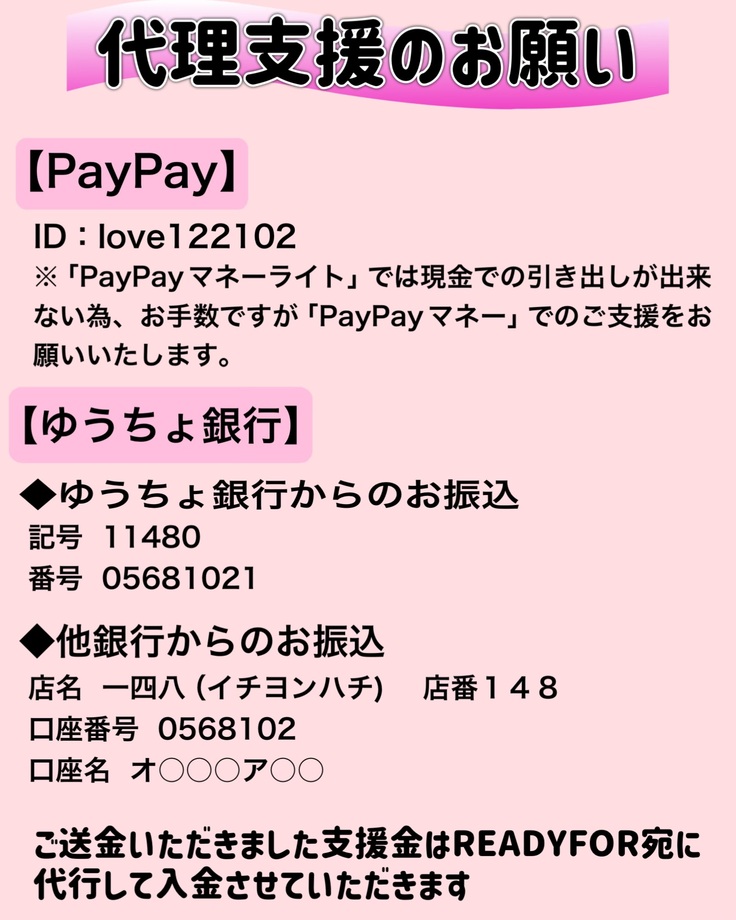 とてもありがたいことに、インスタグラムにてみなさまからいろいろなお声をいただき、代理支援にゆうちょ銀行も追加で掲載させていただくことになりました。