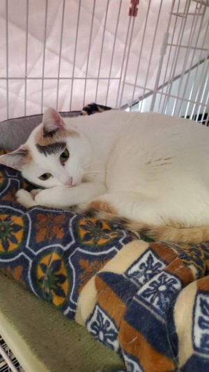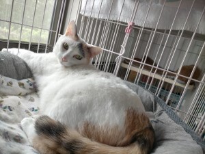 体は真っ白、耳としっぽに三毛が入っているおしゃれさんです。