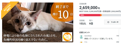 あと10日、猫たちの安全のためのダブルドア設置、保護や病気で増えている医療費に向けての挑戦を続けています。引き続き、ご支援・拡散ご協力など、どうぞよろしくお願いします。
