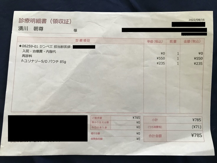 ( 再診料550円+ロイヤルカナン ユリナリーS/O パウチ 85g 235円=785円(税込) )