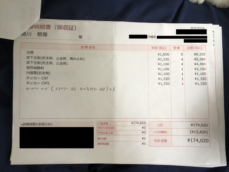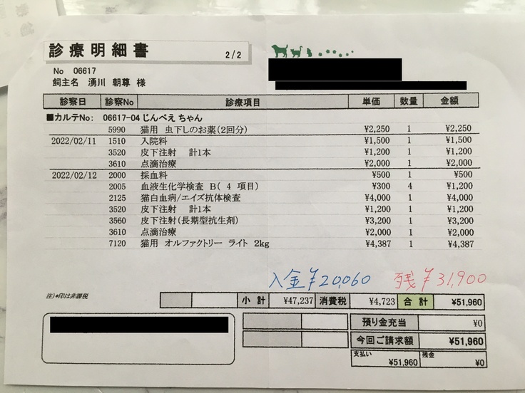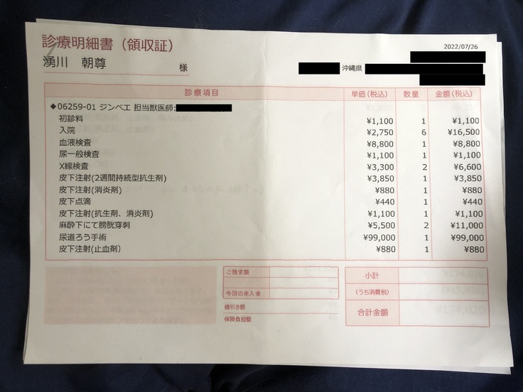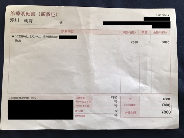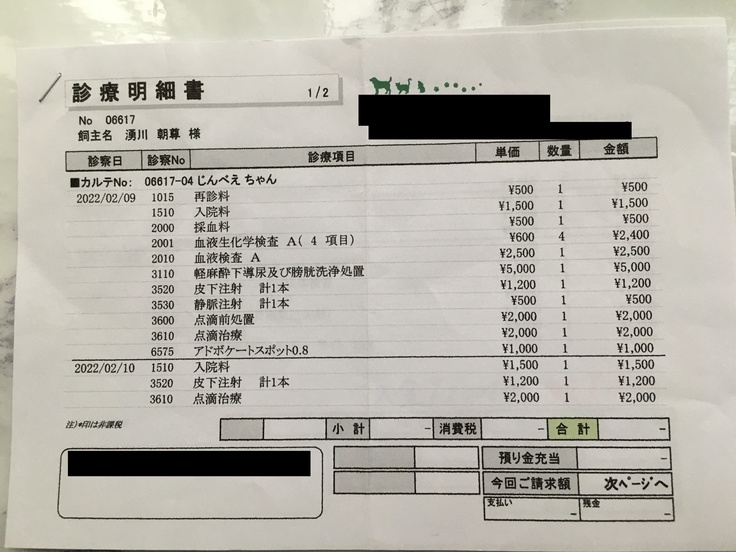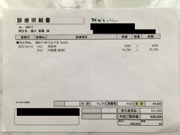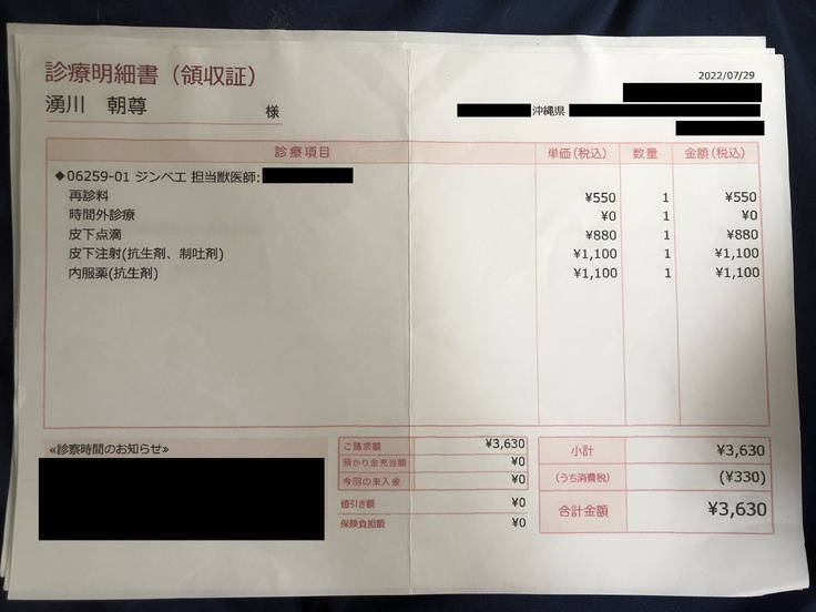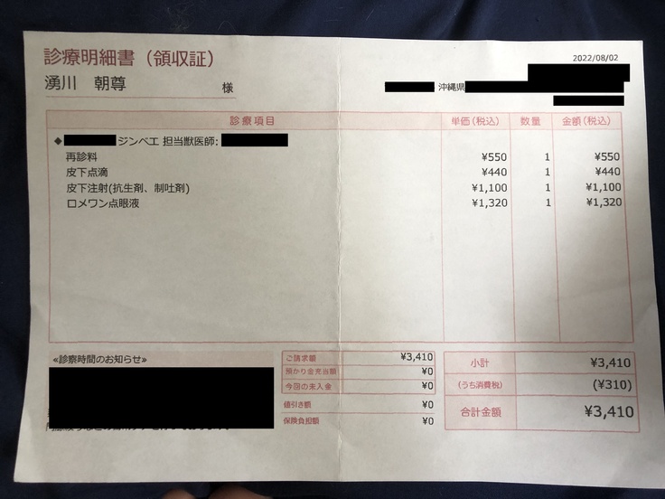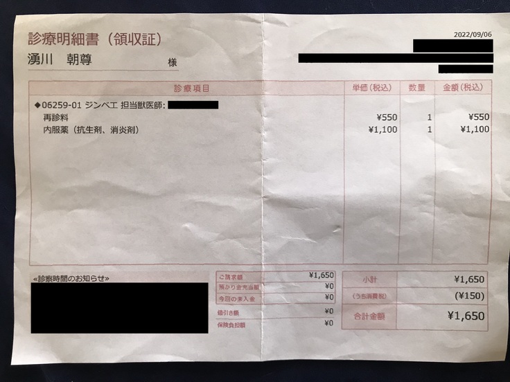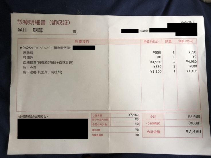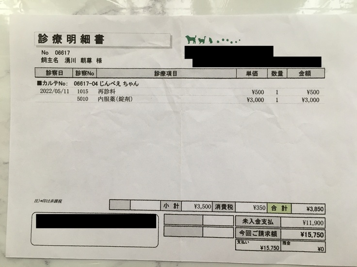 (私の体調不良により、夫が動物病院を受診したため、診療明細書の宛名は”湧川 朝尊”になっております。)