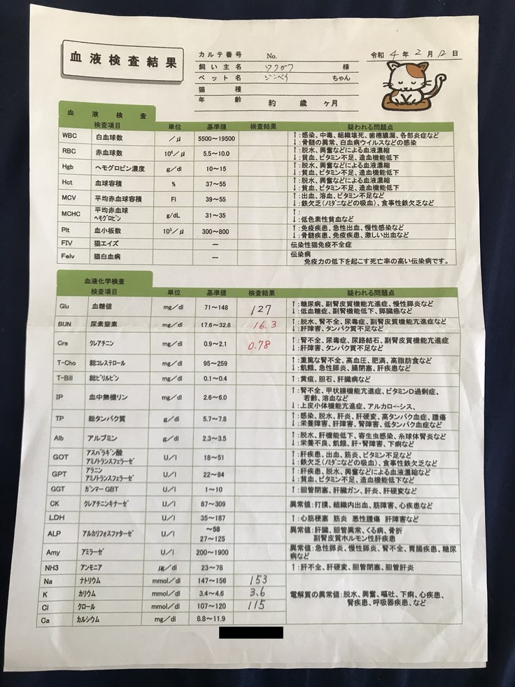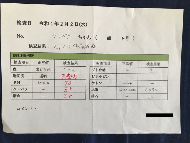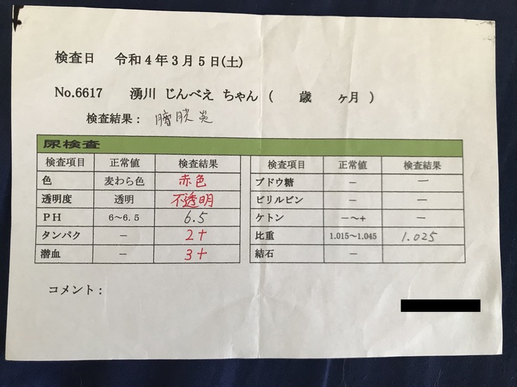 しかし、翌月2月に、急に尿が出ず嘔吐し、グッタリし始め、膀胱が破裂寸前となっておりました。