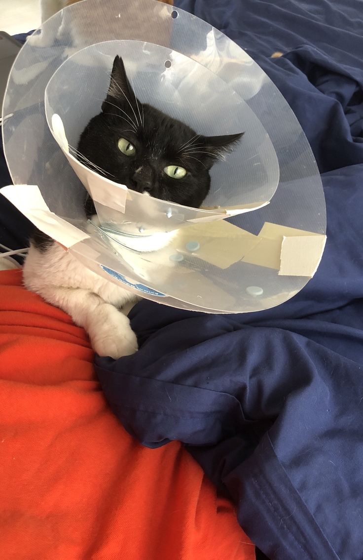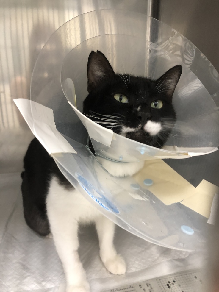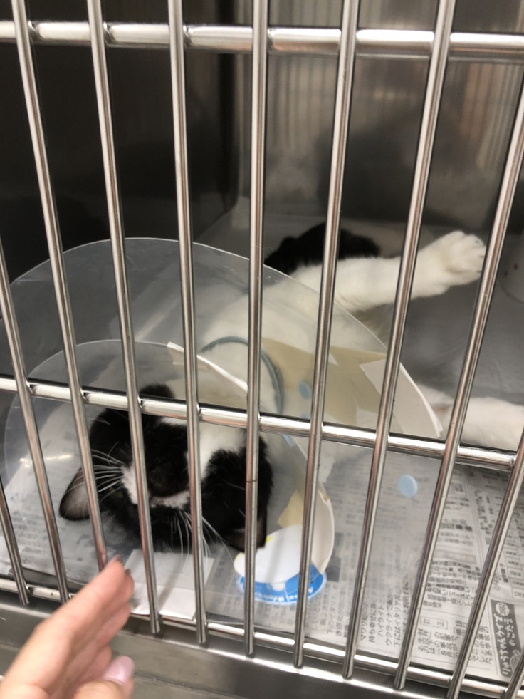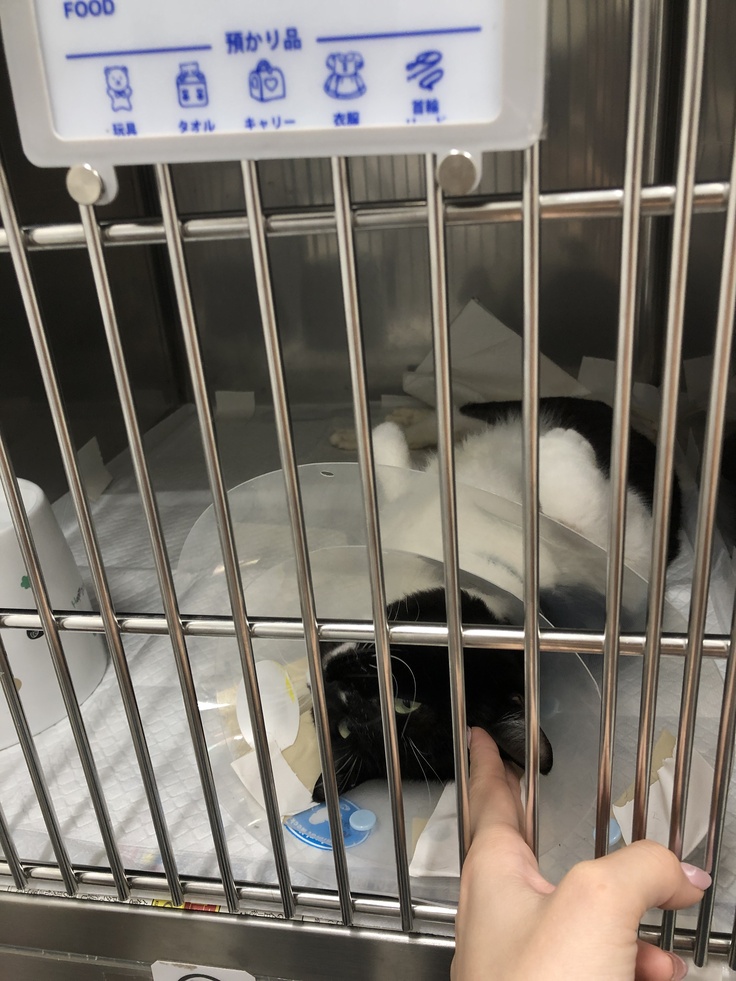 自宅では食欲がなく、なかなか食べてくれない中、4回目の経過チェックで、炎症による感染症が起き、尿道部分の下にも穴が開いており、傷口がうまく引っ付いていないことが発覚し、11日間の再入院となりました。