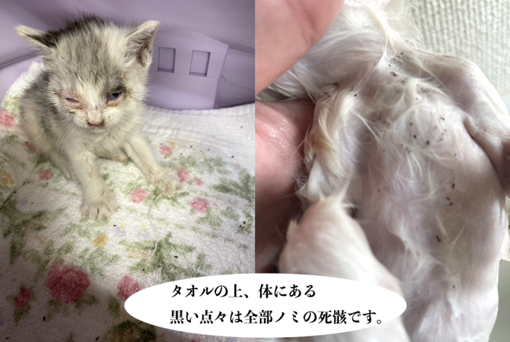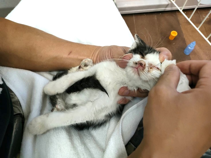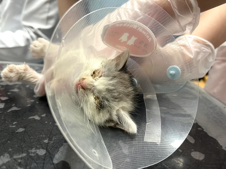 子猫を保護し動物病院へ連れて行くと、既に事故に遭っており横隔膜破裂・失明・下半身麻痺があり、緊急手術となりました。