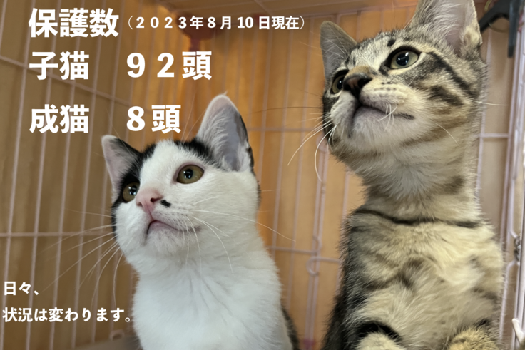 しかし、例年ある保護猫のシーズンオフが無く、今年度に入ってから例年に比べ現時点で保護猫の保護件数、相談数が増加しています。2022年は、144匹を里親さんのもとへ送り出すことができましたが、今年度(2023年8月10日現在)は、昨年より保護数も増えています。