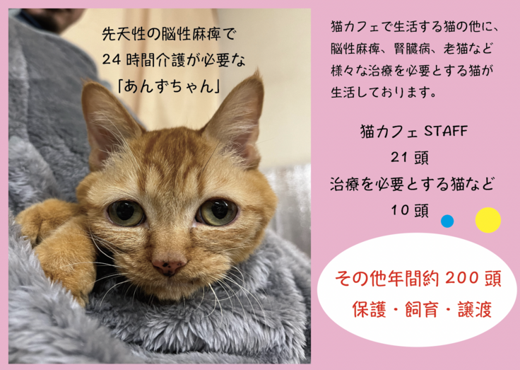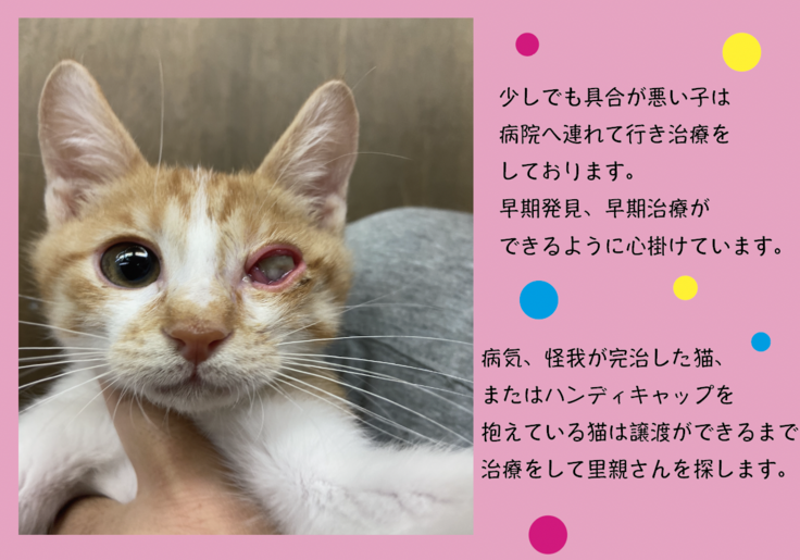 その一心で活動し、現在までに約1,200頭譲渡しております。 譲渡できる条件の猫たちの譲渡率は、現在100%。頭数に限界はありますが、脳性麻痺で24時間体制での介護が必要な猫、虐待で両脚を失った猫、狩猟の罠により前脚を失った猫、交通事故で脳挫傷の猫など、さまざまな障がいを抱えているために譲渡ができない猫たちは、終生飼育の前提で、私たちのもとで暮らしています。