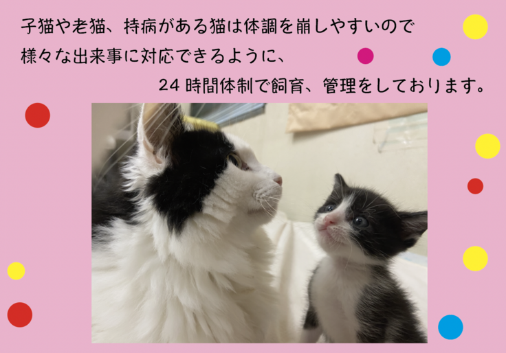 保護した多くの猫を飼育するには、その分だけ餌、砂、医療費などの飼育にかかる費用はもちろん、保護猫活動にかかる光熱費や人件費、施設管理費等がかかります。 小さな子猫がいれば低体温症にならないように保温しなければなりません。ここ郡山市は盆地の地形をしているため、夏は熱がたまりやすく、冬は冷気がたまりやすい、季節による寒暖差が大きな地域です。暑い時期は24時間冷房、寒い時期は24時間暖房をつけて空調管理を徹底しています。 しかしこうした管理を行なっていても、特に子猫は母親の免疫が切れる時期には風邪をひきやすくなり、体力もないため、さまざまな治療が必要となることが多く、医療費もかかります。