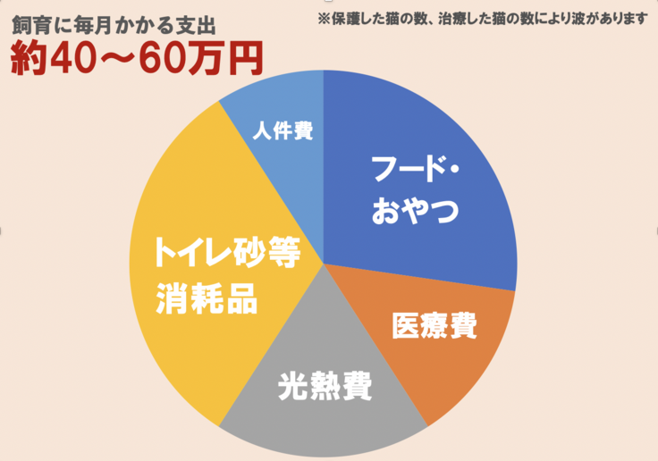 猫たちが生きていくには、医療費や餌代、施設の維持管理にかかる費用が必要です。