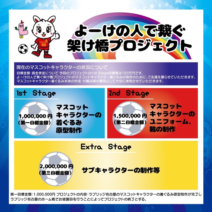 第一目標金額:1,000,000円 プロジェクトの内容:ラブリッジ名古屋のマスコットキャラクターの