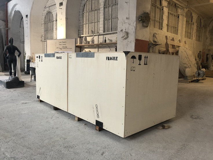 写真は、イタリア・カラーラの彫刻アトリエで、コンテナに入るのを待っている「ラバーズ」特製クレートです。専門の職人さんが二人で4日間かけて作ってくださいました。間も無く釜山に到着予定で、その後富山新港に参ります。無事の到着を祈っていてくださいね!