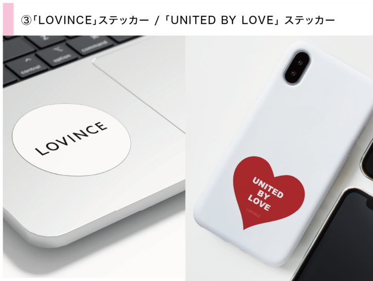 ブランド名である「LOVINCE」と今回のプロジェクト名である「UNITED BY LOVE」の2種類のステッカーをご用意しました。ぜひ、この輪をみなさまに広げていただけると幸いです。