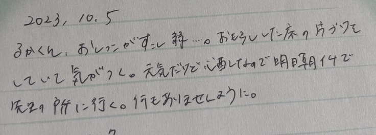 2023年10月、お家でるかくんの失敗したトイレの後始末をしているとおしっこが異常なくらい真緑になっていることに気づき、慌てて病院にいきました。