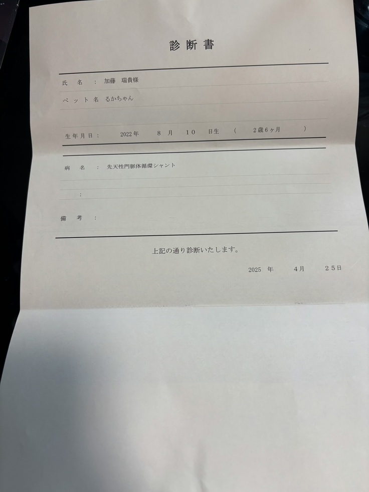 先生からは、少しでも早い段階で先天性門脈体循環シャントの手術を受けた方が術後発作のリスクが軽減すると聞いており、最短で予約をとって4月に手術をする予定です。術後発作症候群などが無ければ、数日で退院予定です。※門脈体循環シャントの手術をした場合、5%の割合で術後発作症候群が起こっているそうです。この術後発作症候群が起こった場合、通常4日で退院出来るのが、経過観察が必要になり、3〜4週間の入院が必要。