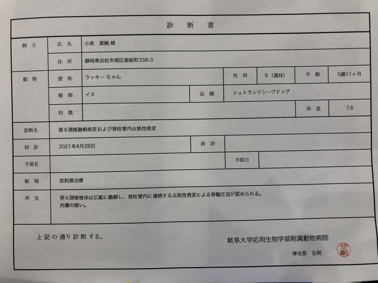 岐阜大学動物病院神経科を紹介していただきました。岐阜大学動物病院での診断は下記の画像になります。手術はリスクが高すぎしない方が良いとの事です。治療方針は、放射線治療により、癌の縮小、神経の圧迫解除による、自立歩行、排尿、排便を目指し。出来る限りの延命をめざします、