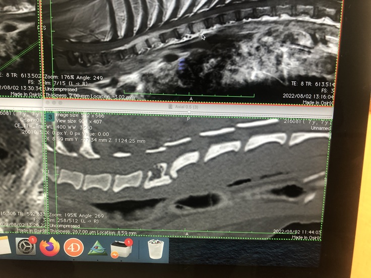 ラッキ-が、岐阜大学動物病院にて、検査、MRI、CT撮影、放射線治療を致します 放射線治療完了後、検査 痛みが止まらない場合は手術の可能性があります。