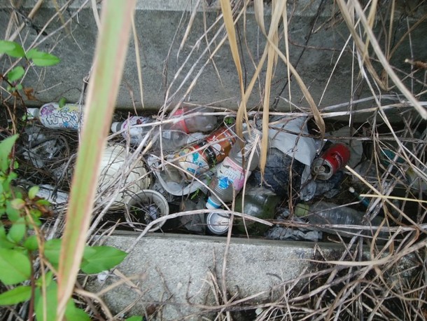 ちょっとした草地や側溝、堤防の石積みの間にはゴミが・・・