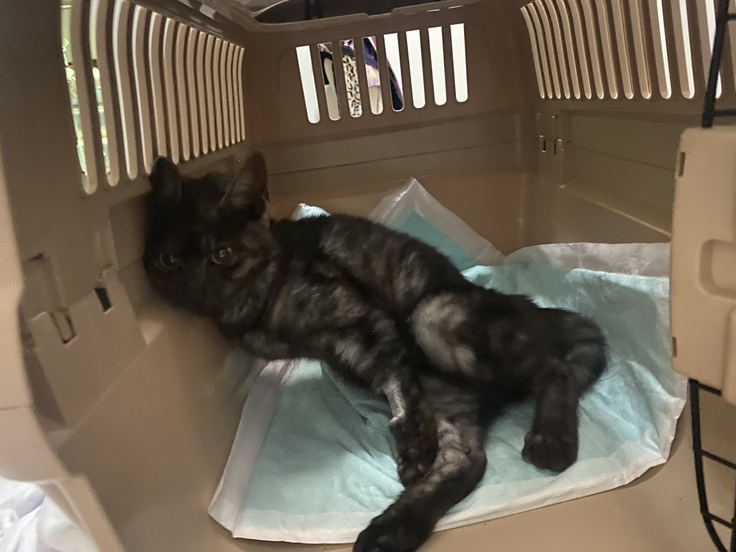 偶然にもまた傷ついた猫(おそらく4,5ヶ月くらいだそうです)との出会いがありました。はねられて道路で動けなくなっていながらも、一生懸命息をしていました。そのまま病院に連れて行きました。入院して検査をしてもらった結果、骨盤を2か所骨折していて、手術が必要と分かりました。そのままにしていると、そのまま骨がくっついてしまって、うんちが出なくなるようです。今脚がちゃんと動かないですが、手術して骨盤を正常に近づけることで、動くようになる可能性があると言われました。