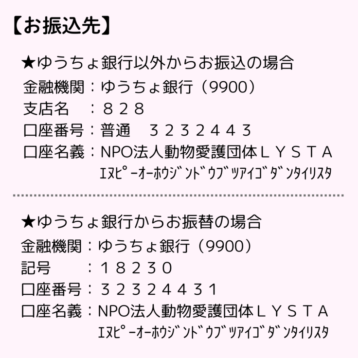 ①LYSTAシェルターか、当会が運営する保護猫ふれあいサロンOhana店頭で申込書にご記入いただき、現金でご支援をお預かりする方法