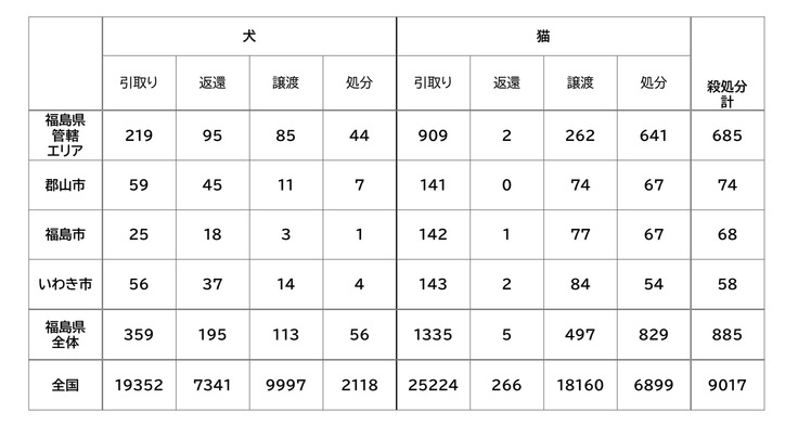 ▼2023年度の「福島県管轄エリアと中核市」「福島県全体」「全国」の殺処分に分けて表にまとめてみました。