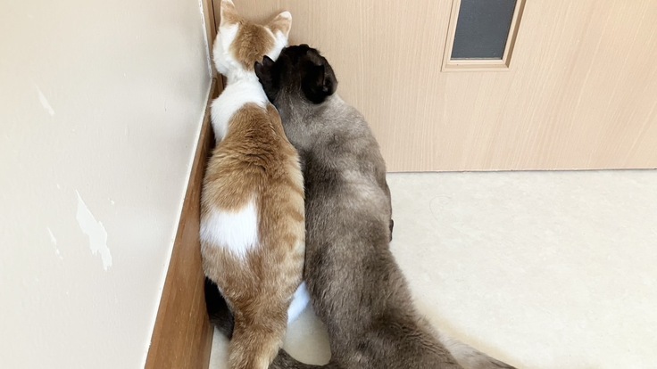 最初こそ距離はありましたが、いまではごはんの時間になると扉を開けるんじゃないかと思うほどの圧で、扉の前で2匹仲良く待機しています。