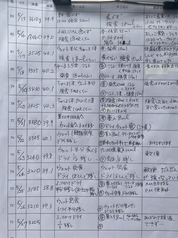 1匹ずつ管理表があり、毎日体重・お熱・食餌量の記録をしています。