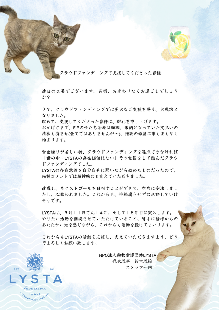 うのちゃんは、前回のクラウドファンディング終了日の翌日に、FIPの診断が下りました。
