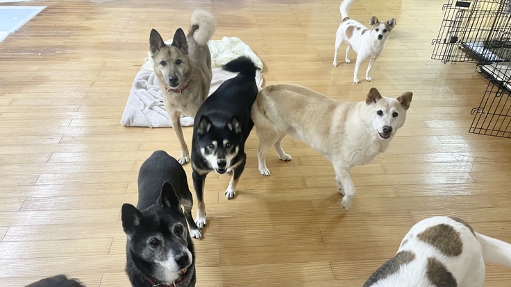 旧シェルター時代、犬たちは日中は外に係留し、夜はコンテナハウスのケージのなかで過ごしてもらっていましたが、移設後は室内フリーで過ごさせてあげられるようになりました。