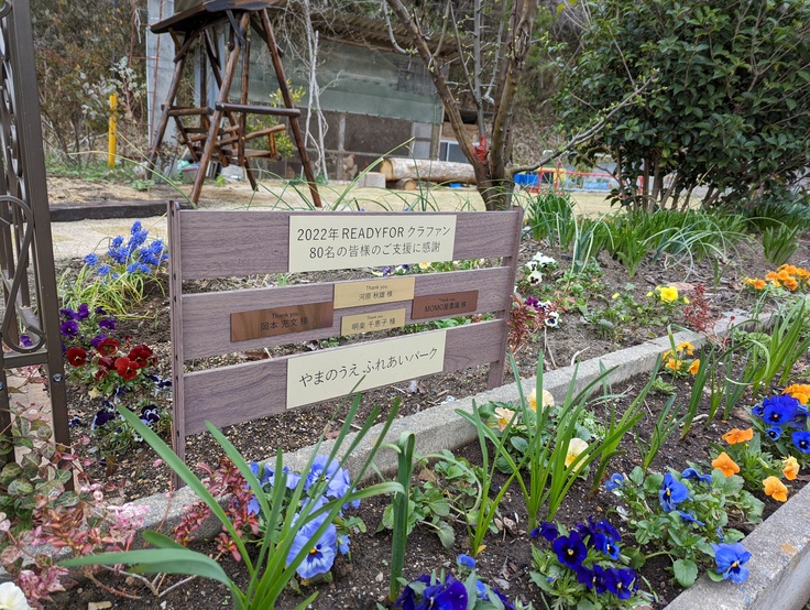 資金使途の内訳は、リターン代19.9万円、遊具費及び設置費50.0万円、憩いの場整備費20.8万円、システム手数料12.0万円、合計102.7万円となりました(不足分は自己資金を充てております)。