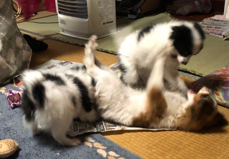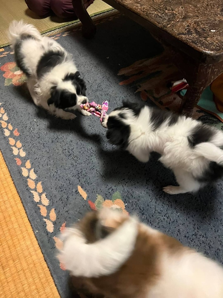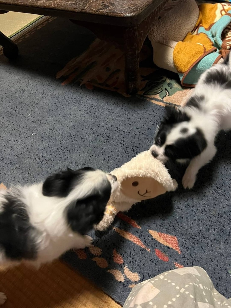 おもちゃで遊ぶのも大好きで、つる子とまる子で引っ張り合いっこをしています。