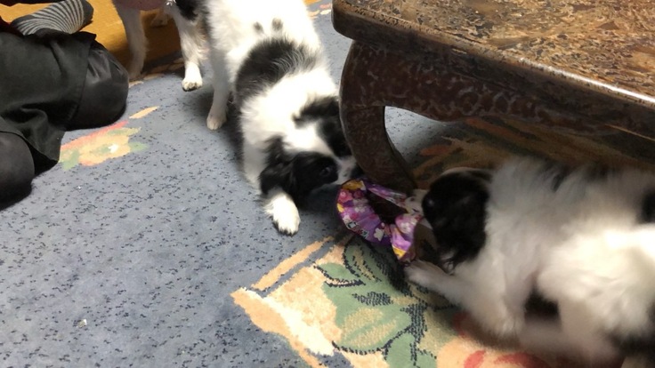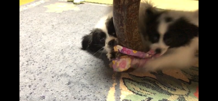 机の脚を軸にしておもちゃの引っ張り合いをしています。