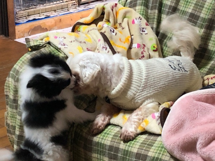 ピンク先輩がくつろいでいるところにちょっかい出しています。