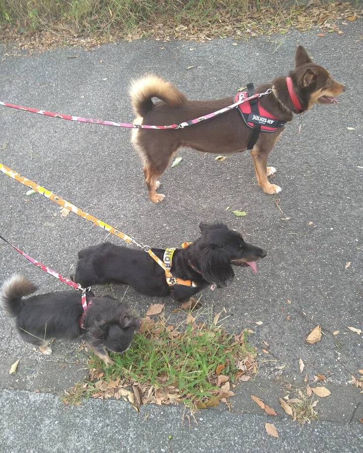 散歩も時間かかり、2人に相談し、まぁくんハウスに来てくださったトレーナーさんのアドバイスを受けて1週間練習し、先住犬の2匹とお散歩出来るようになりました