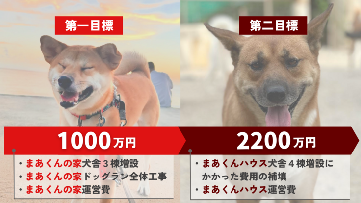 処分の期限が迫り、保護を必要としている野犬が増えてしまったために緊急の対応となりましたが、ネクストゴールに向けて引き続き応援してくださる皆さまに増設費の補填と、この先のまあくんハウスの運営費数ヶ月分をご支援いただけたらと思っています。