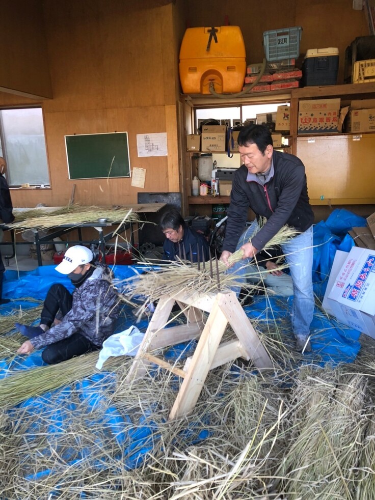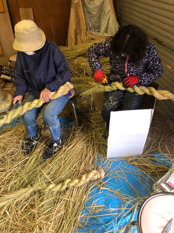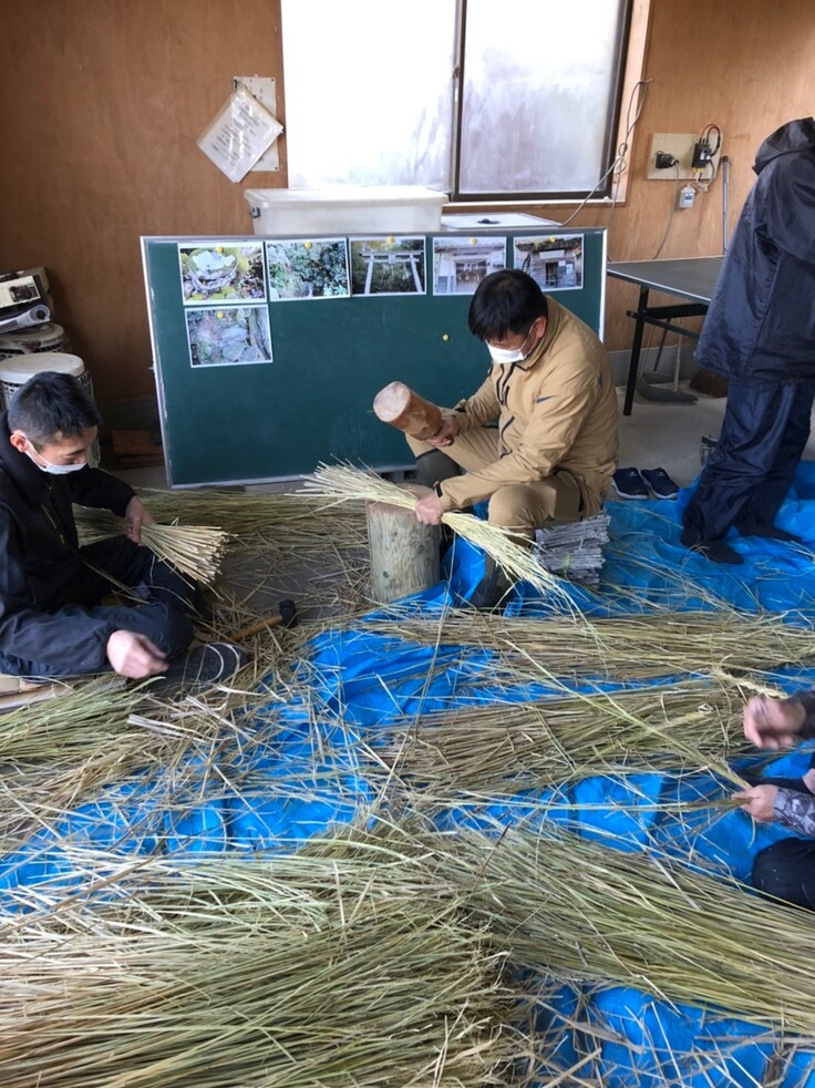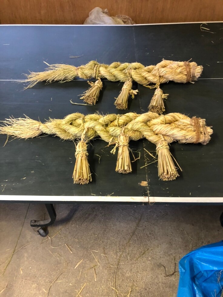 材料は、自治会で調達したもち米の藁です。(長いのでしめ縄に適しています)