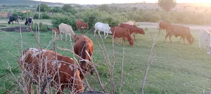 これは、マサイの村です。子牛たちがたわむれ、のどかです。オレンジの服を来た女性の奥の方にうっすらと見えているのが小学校のようです。