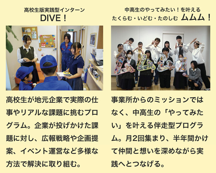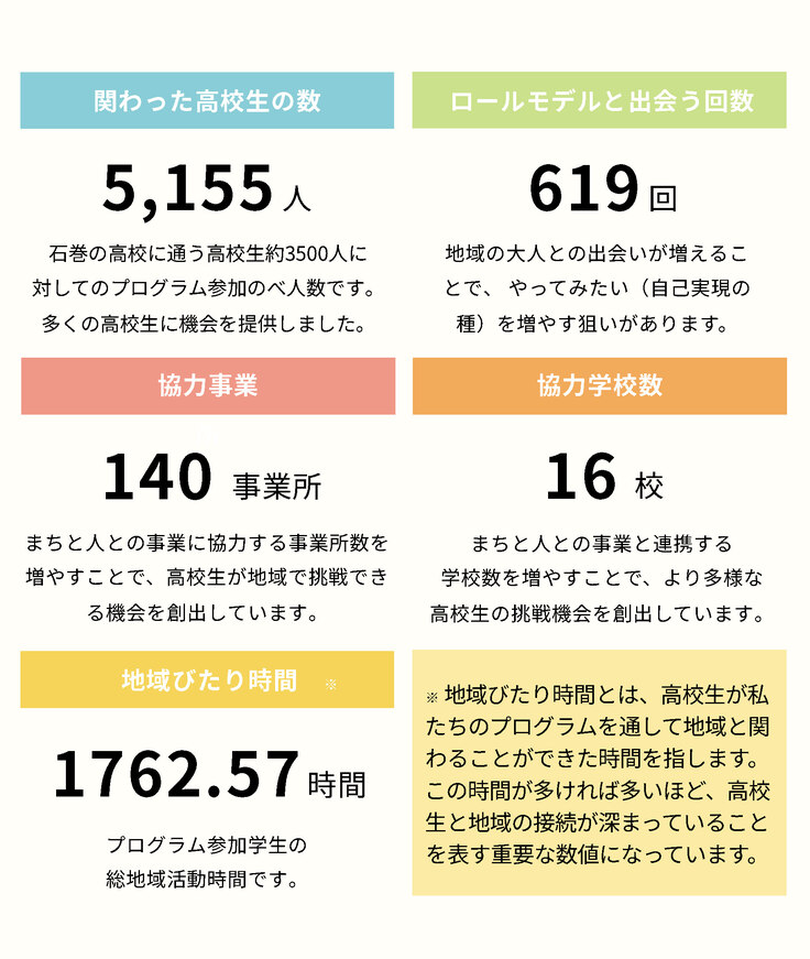 石巻地域の高校生を主対象に、地域で挑戦したい若者の伴走・プログラム提供を行う。高校の総合的な探究の時間の授業サポート・コーディネートや、「まきボラ」や「DIVE!」、「ムムム!」などの実践的な地域体験や課題解決に取り組む機会を創出している。地域への興味関心の醸成や、挑戦・成長意欲の向上を目指している。 年間を通しての高校生支援者数は5000人、地域とであうプログラムの実施数は600を超える。
