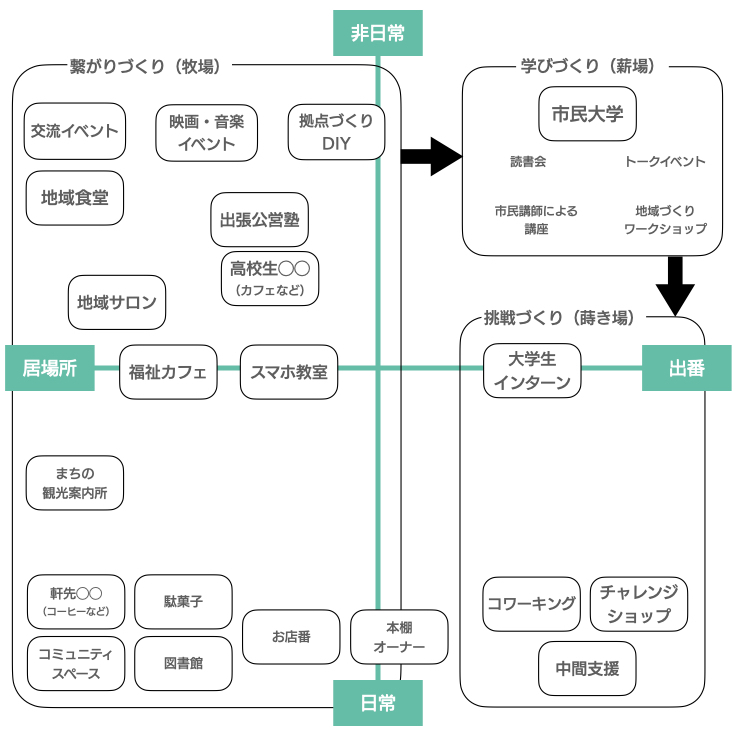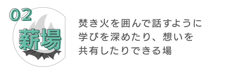 2つ目は、焚き火を囲んで話すようにそれぞれの想いを共有したり、学びを深めたりする「薪場(まきば)」。このプロジェクトも、自分が思っていることを伝えることから始まりました。自分のやりたいことや町に対する思いを共有することができる場にしたいという願いを込めています。