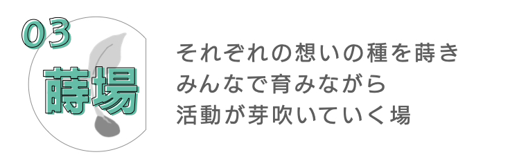 そして、3つ目は、やりたいことやワクワクといった、一人ひとりが持つ種が芽吹いていく「蒔場(まきば)」。10年後、20年後に向けた取り組みがここから芽吹いていく場になるよう、種を「蒔いていく」場にしていきます。