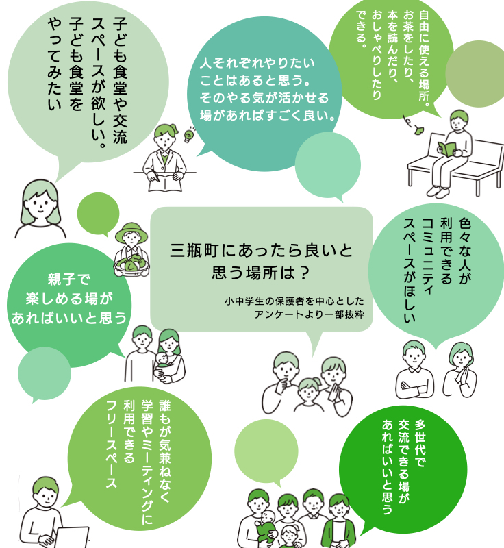 町の方がどんなことを求めているのか、考えているのか知りたいと思い、実施した小中学校の保護者さんを中心としたアンケートでは、「交流スペース/コミュニティスペースが欲しい」や「多世代で交流できる場があれば」「人それぞれやりたいことを実現できる場」といった声が多くありました。