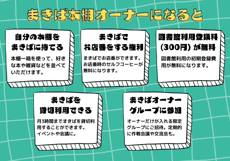 1つ目のネクストゴールは、「本棚オーナー」15名(現在5名)を目標にし、オーナーとしてまきばをこれから一緒につくっていってくれる仲間を募集します。
