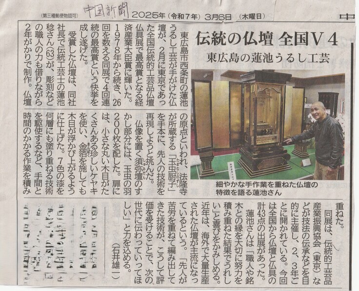 ご後援いただいておられる塗師の蓮池稔さんを含む6人の匠(木地師:中野章さん、宮殿師:島本覚さん、欄間師と須弥壇師:山口昌之さん、蒔絵師:真志田徹さん、飾金具師:吉田州伸さん、塗師:蓮池稔さん)による仏壇が日本第一位となり、初の四連覇を達成いたしました!