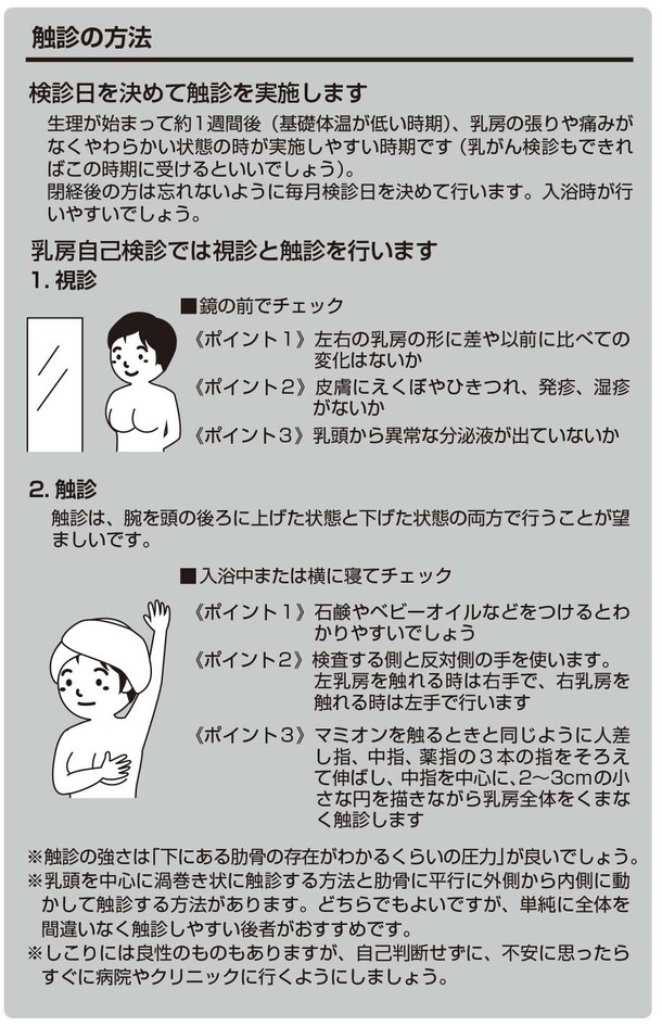 早期発見をする為には、年に1回の病院での定期健診に加え、月1回の定期的な自己触診を行うことが重要です。