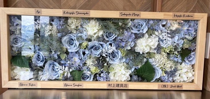 お店の中のブルーと白をイメージして、ブリザードフラワーで作ってくださいました!