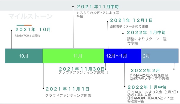 おはようございます。皆様冬の訪れが厳しくなってきましたが、いかがお過ごしでしょうか?クラウドファンド成功にご助力いただき本当にありがとうございました。本件クラウドファンド終了までの流れを図にしました。ご確認いただければ幸いです。リターン品につきましては暫くのあいだお待ちください。どうぞご理解のほどよろしくお願いします。